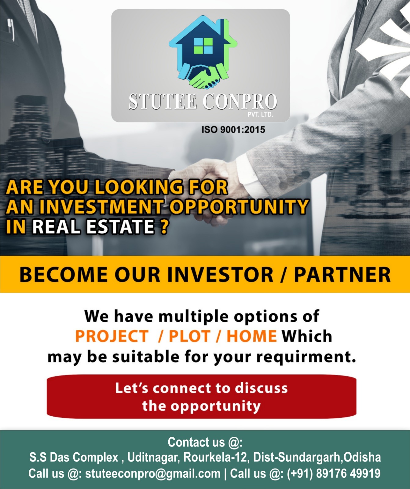 " Incorporated in india on 12 April 2018, 15 years and 11 month 29 days old). et, registered aftree es ein Sindes garb, odisha, inpla This company is engaged in the real estate industry and has headquarter in Rourkela odisha.india.stutee conpro originating from odisha has committed its energies to furnish , affordable, and luxurious home and plots for the masses and customer satisfication. We have always tried to indicate new thought and concepts in to the surrounding with the same ideals in mind. We have ventured to all odisha & west Bangal. 1. "
